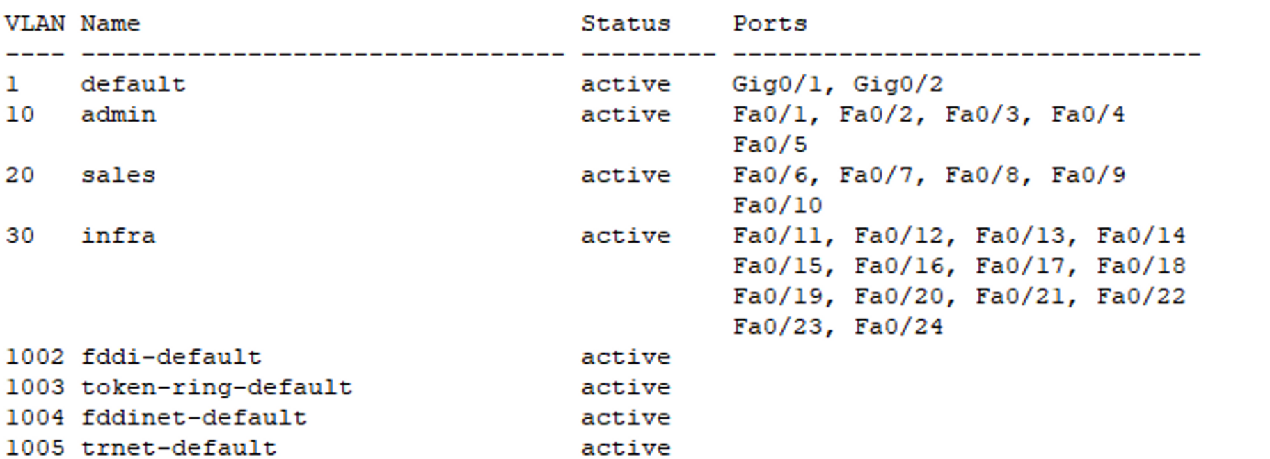 do show vlan 혹은 do show vlan brief 명령어로 VLAN의 이름과 포트 할당이 잘 되었는지를 확인한다.