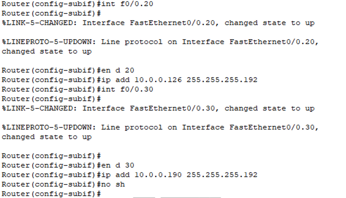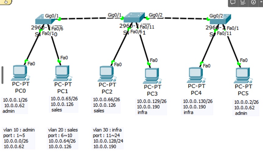 이전에는 각 스위치 별로 같은 네트워크 대역을 할당했기 때문에 router만 설정해 주어도 종단 장치(PC, Server)끼리 통신이 잘 되었다. 하지만 이번에는 하나의 스위치에 두 개의 PC가 묶여 있지만, 다른 네트워크 대역을 점유하고 있다.