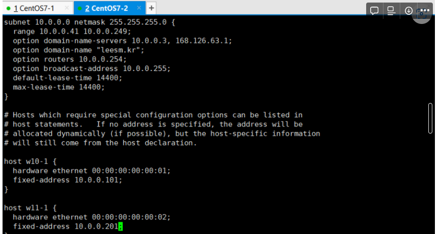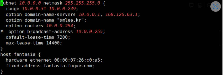 /etc/dhcp/dhcpd.conf 의 파일을 아래처럼 바꿔준다.