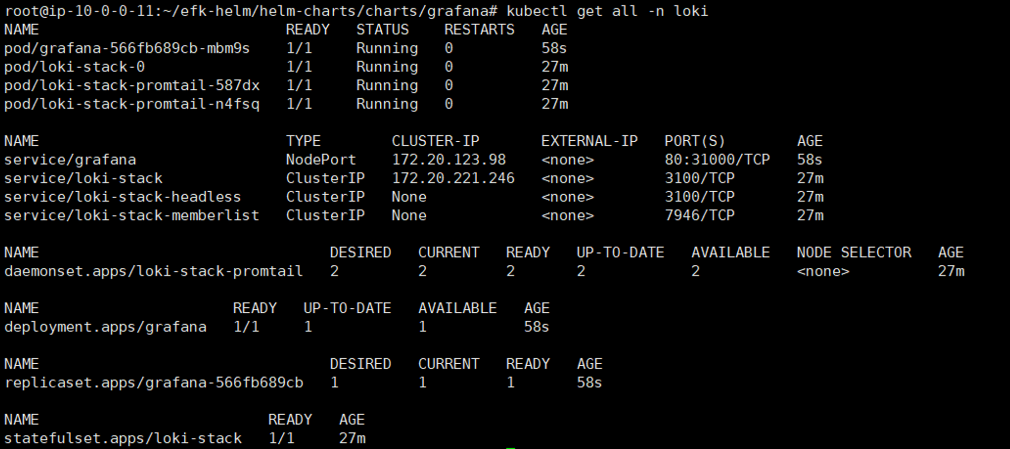 helm upgrade -install loki-stack --create-namespace --namespace=loki -f loki-simple.yaml grafana/loki-stack
