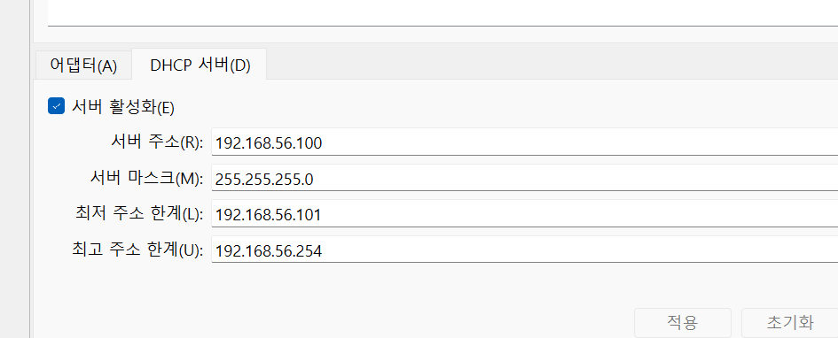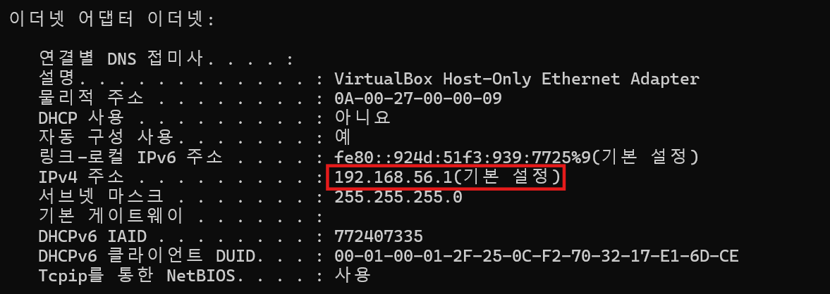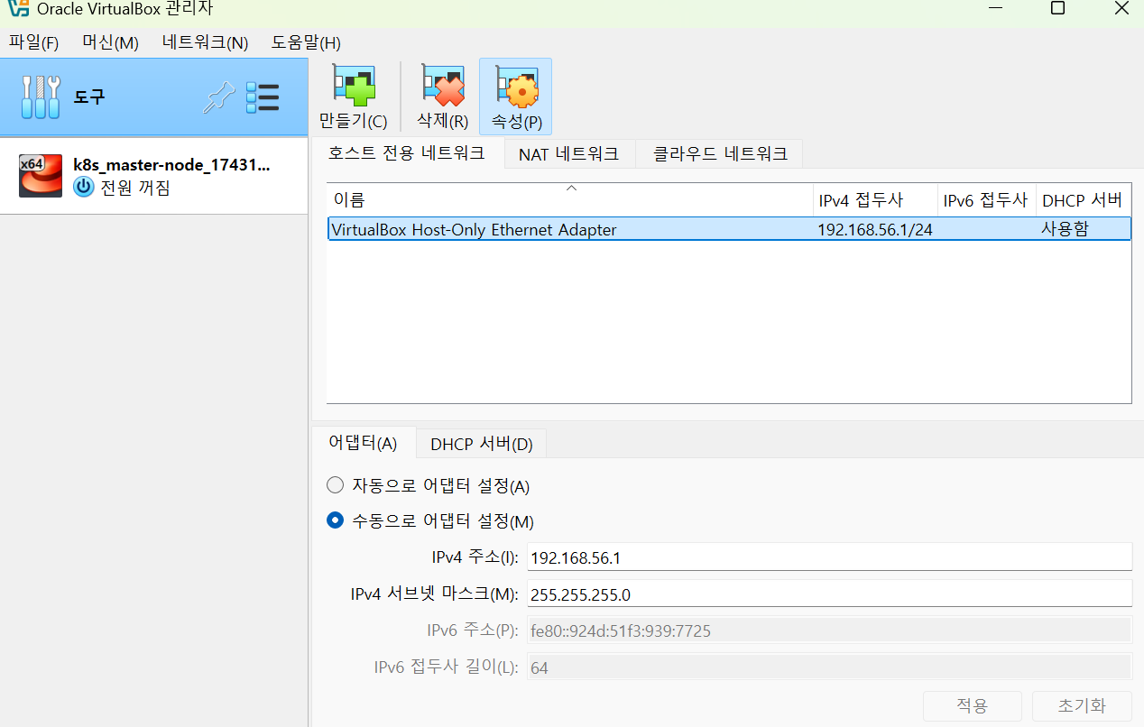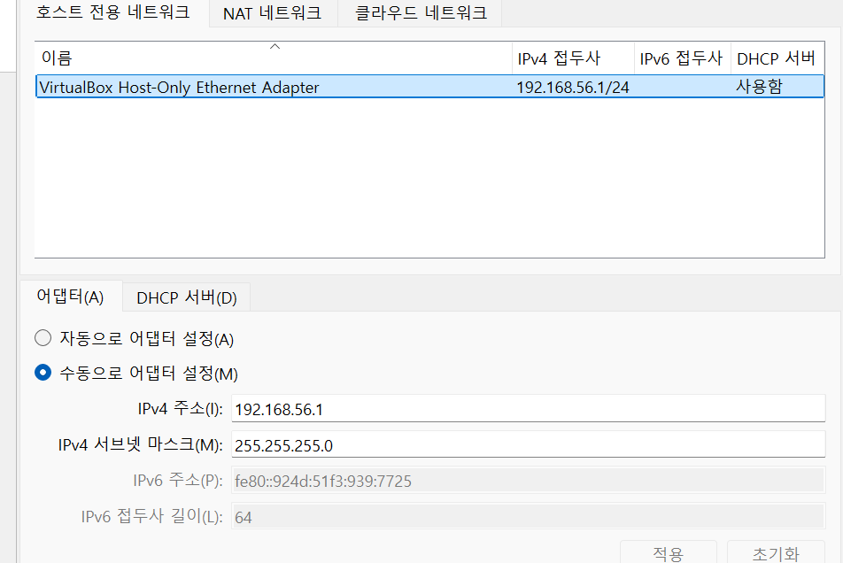 ▲ 이때 IP CIDR는 192.168.56.1/24 이므로 내 VM 들에 192.168.56.X 가 할당된다. (물론 이 Adapter가 연결 되었다는 가정 하에)