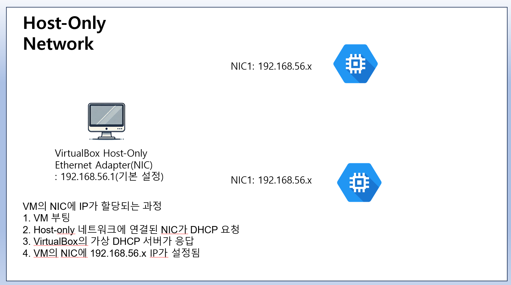 내 컴퓨터에서 VirtualBox VM으로 통신을 보내거나, VM에서 내 컴퓨터로 통신을 보낼 땐 Host-Only를 사용한다. (혹은 VM끼리 통신할 때도)